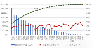 從全國建筑業(yè)企業(yè)房屋竣工面積構(gòu)成情況看,住宅房屋竣工面積占最大比重,為56.62%;廠房及建筑物竣工面積占21.14%;商業(yè)及服務(wù)用房屋竣工面積占 7.52%;其他種類房屋竣工面積占比均在5%以下。